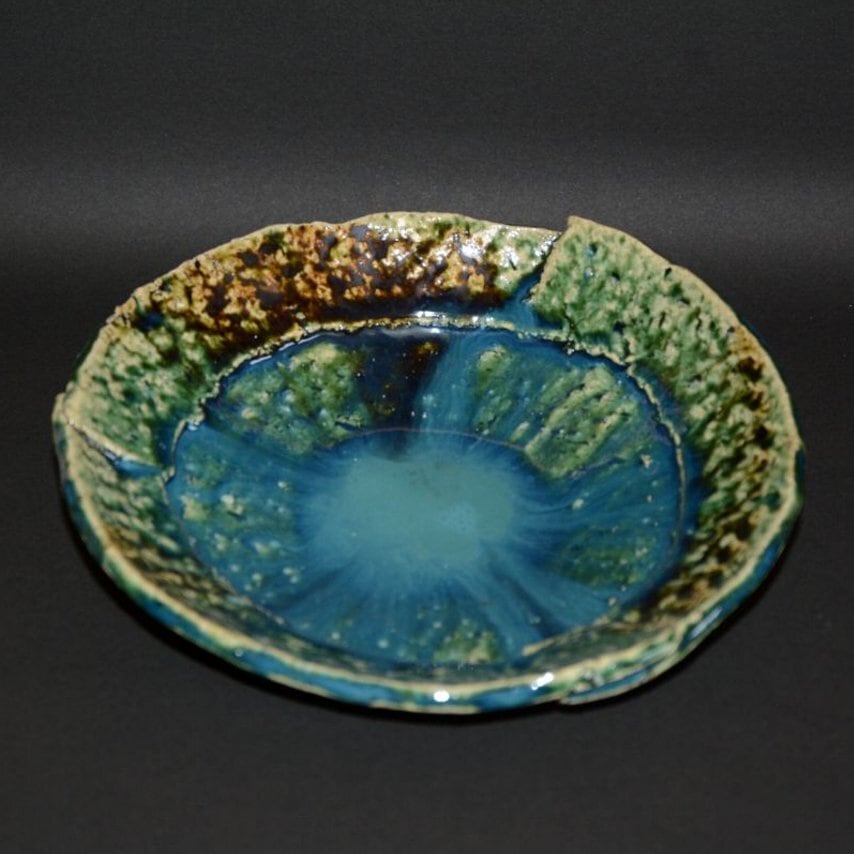 深い織部釉の発色が見事です。土を重ね合わせて成型をしております。