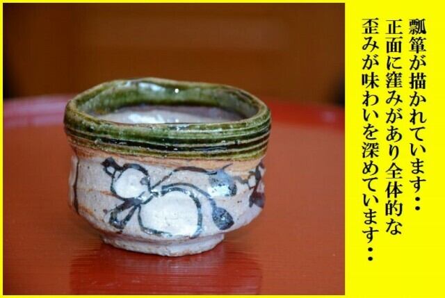 千利休の高弟でもあった古田織部の指導により作られた焼物。深い緑色の緑釉と豊かな創造性に富んだ個性的な形状、幾何学的に紋様化された装飾が特徴的です。作風により様々な呼称があり、「黒織部」「青織部」「総織部」などがあります。