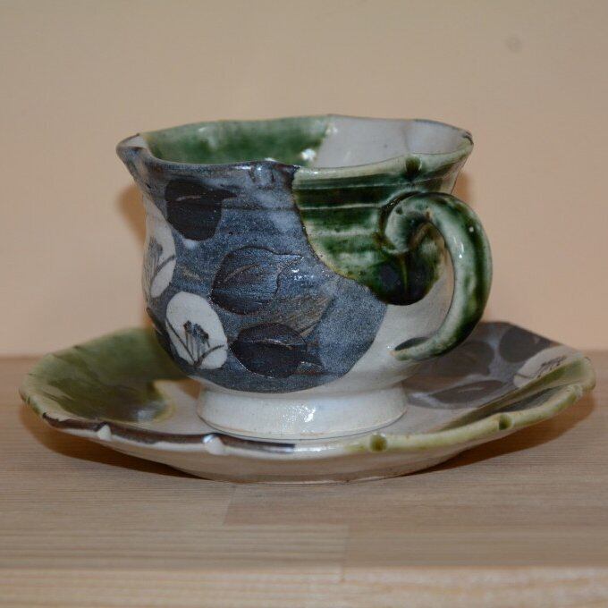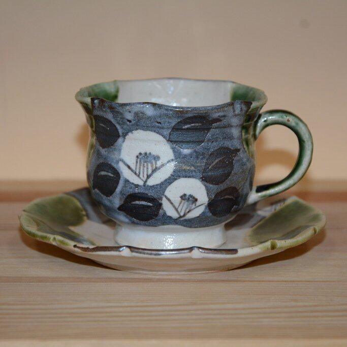 美濃焼 織部椿文珈琲碗皿 コーヒーカップ 玉山窯 玉置兼光